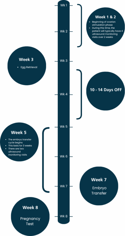 There are 8 appointments during those 8 weeks, divided into 2 parts. The first 2 weeks consist of 4 monitoring appointments and the egg retrieval. Next you will have about 10-14 days completely “off”. The embryo transfer cycle starts at week 5 and lasts 3 weeks. During this time you will have 2 monitoring appointments and the embryo transfer.